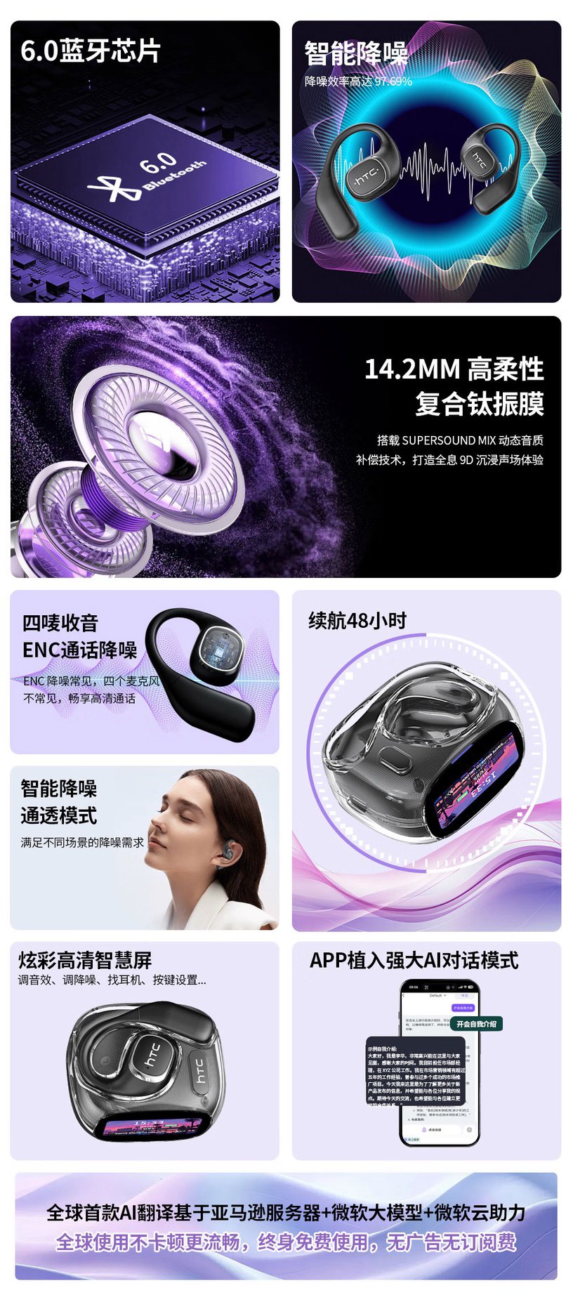 同传翻译等功能,HTC 现已在京东上架一款型号为 NE7 的带屏开放式蓝牙耳机,支持蓝牙 6.0 技术,口令等形式),这款耳机采用开放式设计,